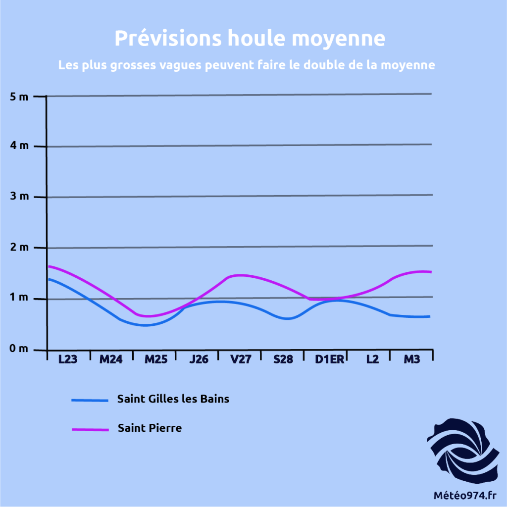 LUNDI, l’alizé d’est soufflera assez fort au Sud et assez fort au Nord où la mer du vent sera agitée. Vent faible et mer peu agitée à agitée ailleurs. La houle sera le plus souvent proche d’1m50 à l’Ouest d’une ligne St-Denis / St-Louis, 2 mètres et un peu plus à l’Est de cette ligne, prudence.