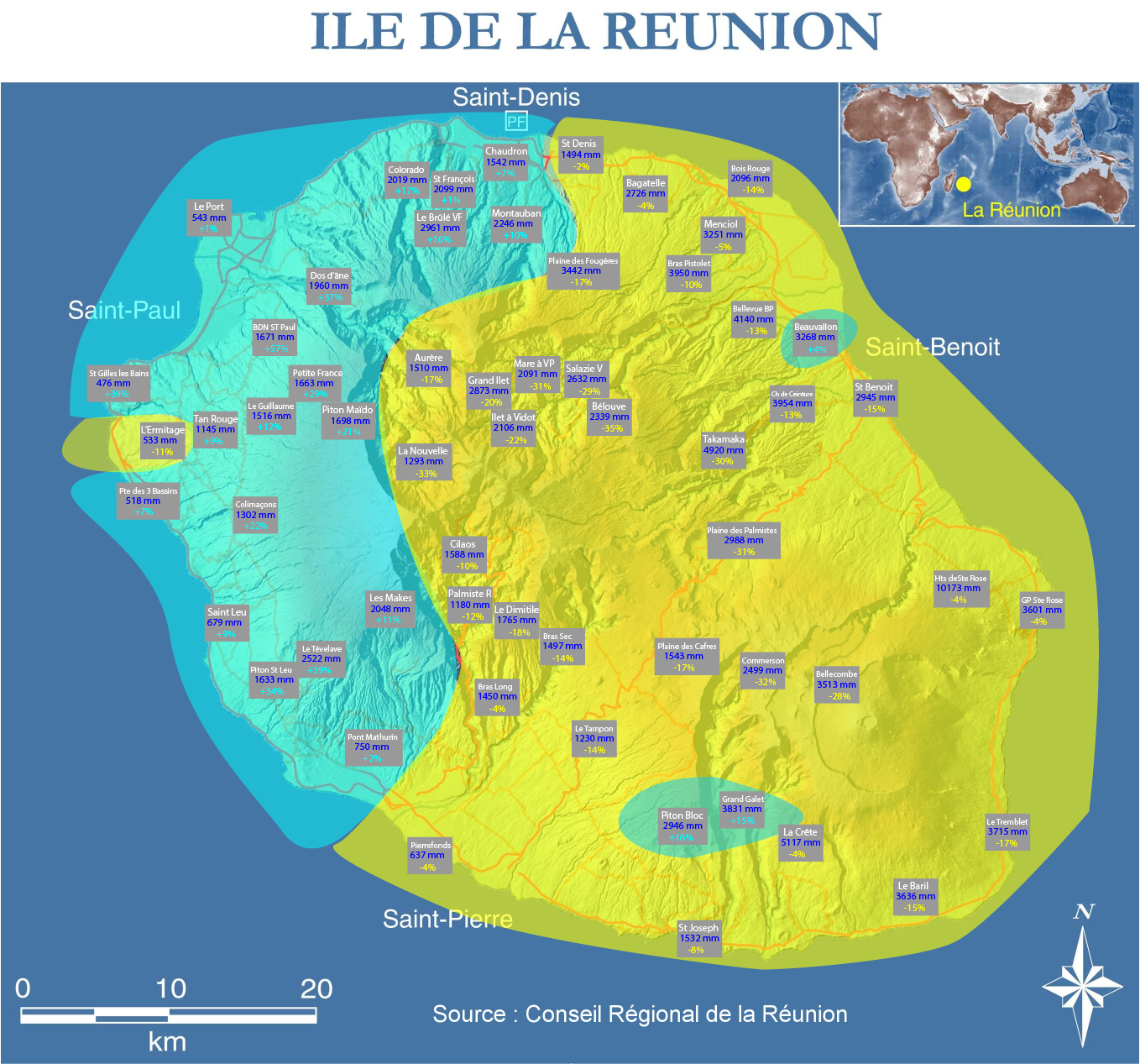 Côté écarts, on note un déficit parfois important sur les 2/3 Est de la Réunion à part Piton Bloc et Grand Galet (+15 à +16%) ou encore Beauvallon, près de Saint-Benoit. Le déficit maximum est de -35% à Bélouve où il n’est tombé que 2339 mm pour une normale de 3593 mm. Les trois Cirques connaissent un déficit notable.