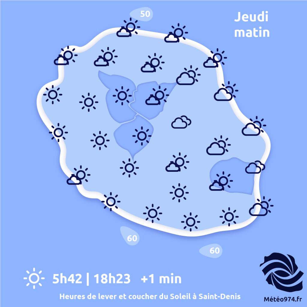 C’est une belle matinée ensoleillée qui s’annonce sur quasiment toute l’île. On notera tout de même quelques entrées maritimes sous forme de grisailles sur la côte Est jusqu’en Forêt de Bélouve et débordant vers la Plaine-des-Palmistes. Quelques cumulus se formeront d’autre part sur les pentes à partir du milieu de matinée. L’alizé d’est à sud-est soufflera assez fort au Nord comme au Sud, jusqu’à 60 km/h. La houle tournera autour des 2 mètres sur tout le littoral, un peu moins au Sud-est. Températures assez élevées.