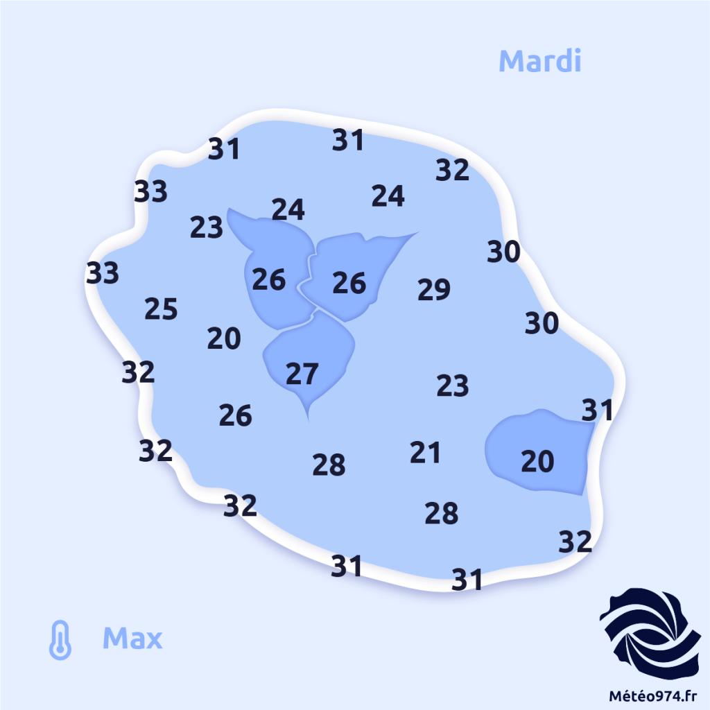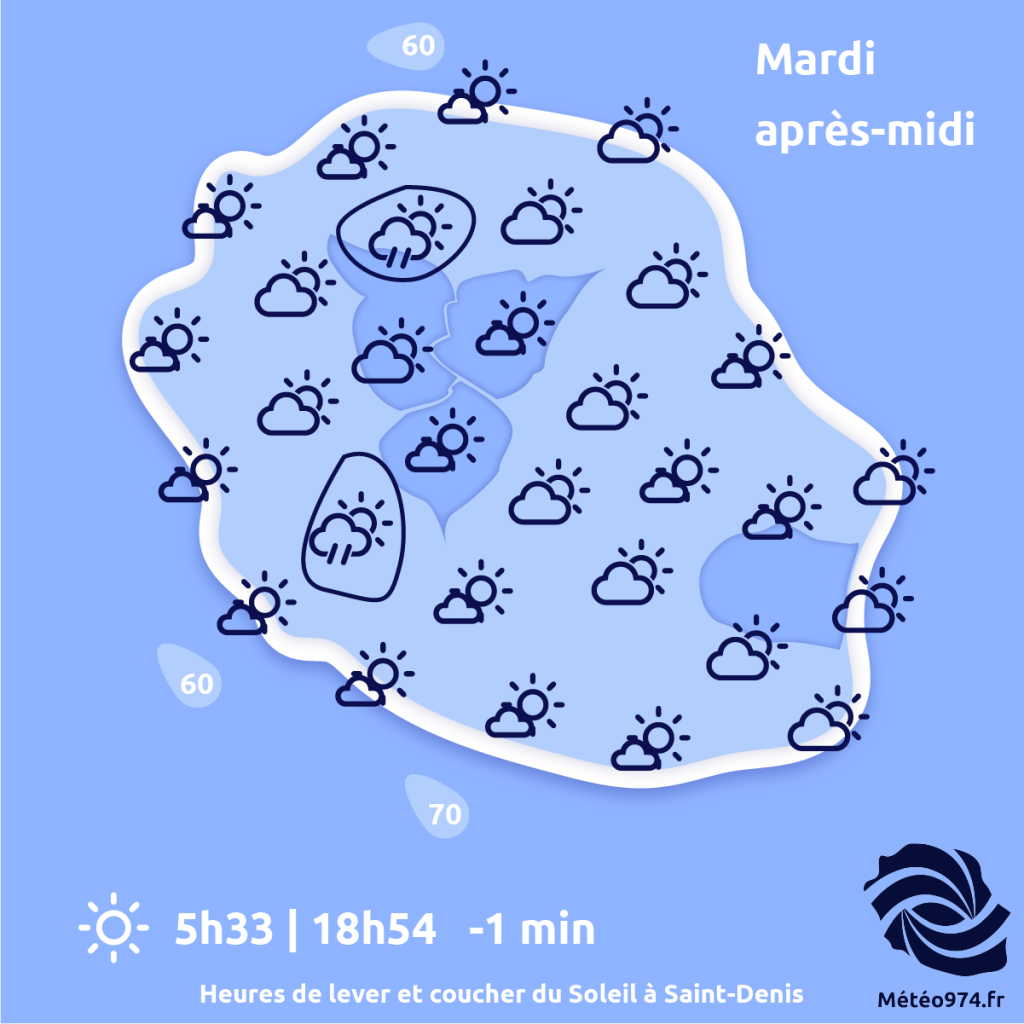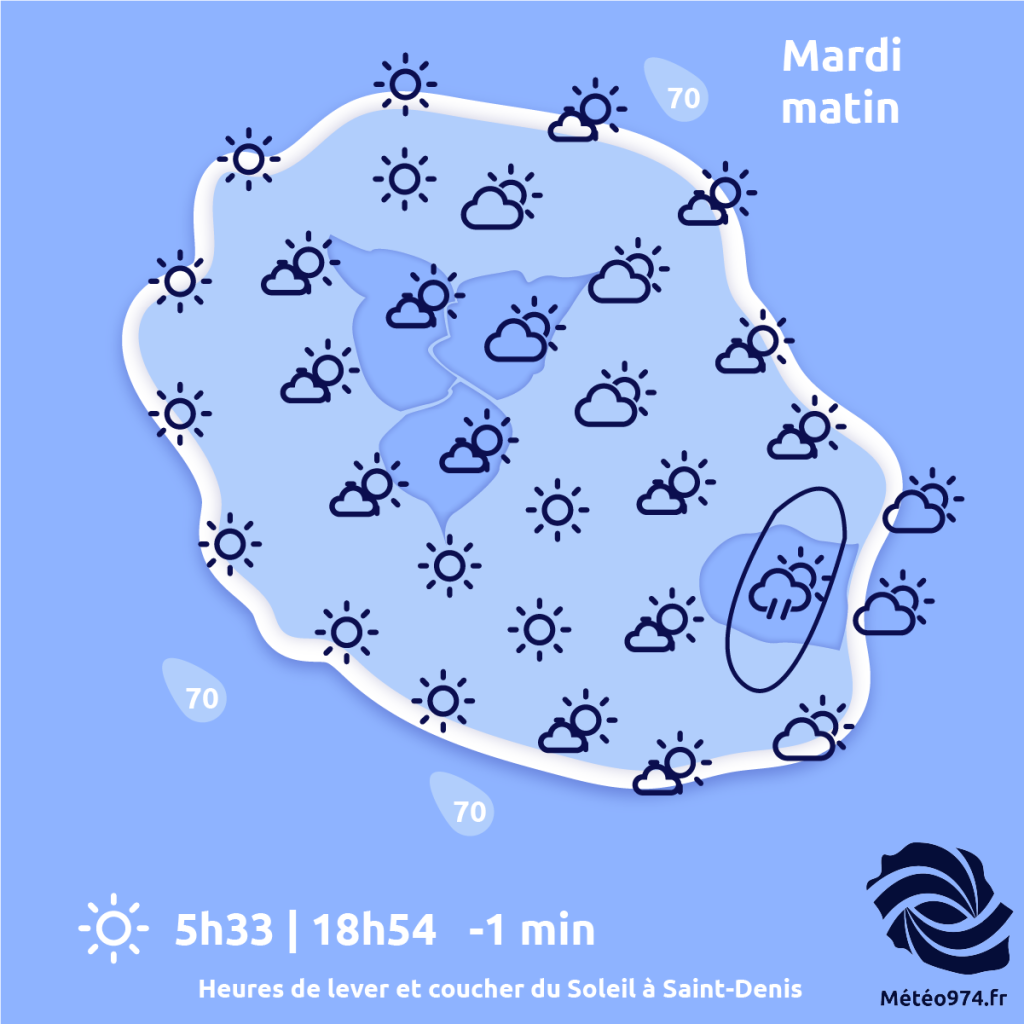 La journée s’annonce bien calme. Quelques rares averses pourront se produire du côté des Hauts de l’Etang-Salé et de Saint-Leu ou encore vers La Montagne. Soleil et cumulus passagers ailleurs. L’alizé de sud-est atteindra 60 à 70 km/h vers l’Etang Salé et Saint-Pierre jusqu’à Saint-Jo et 60 à Saint-Denis. Il restera modéré ailleurs. La houle poursuivra sa baisse. Températures estivales.