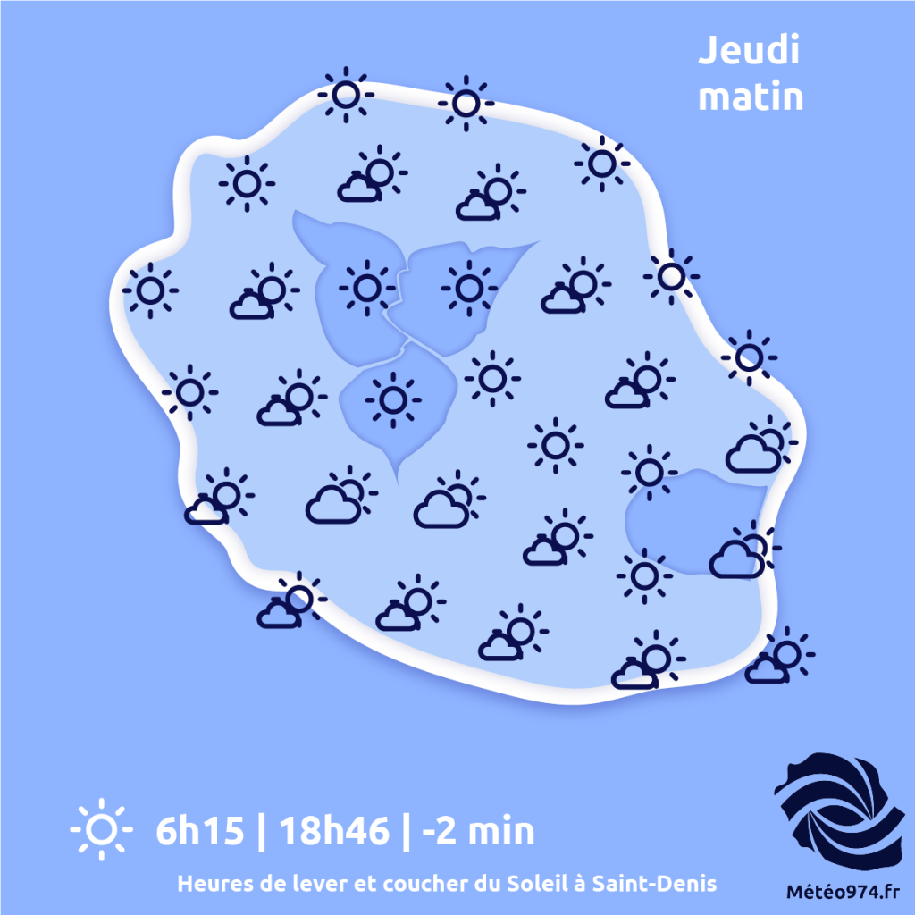 C’est le soleil qui réveillera la quasi-totalité des Réunionnais jeudi matin. Quelques nuages traîneront sur le Grand Brûlé et des cumulus de pente se formeront en matinée entre les Hauts de Saint-Pierre et les Makes. L’alizé de sud-est sera faible à modéré. Quant à la houle, elle ne dépassera pas 1 mètre à 1m50. Chaleur de saison.