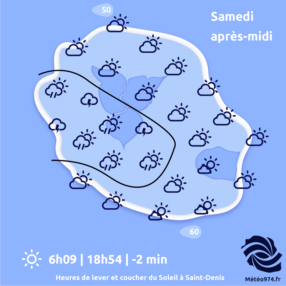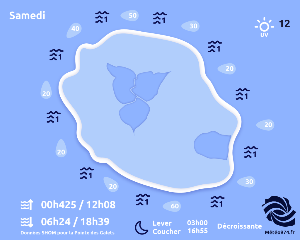 SAMEDI 14 FÉVRIER : Coups de foudre pour la Saint-Valentin ! Des conditions sèches et ensoleillées s’imposeront à travers une grande partie de la Réunion parmi des cumulus devenant tout de même assez joufflus. Ils pourront dégénérer en averses et orages...