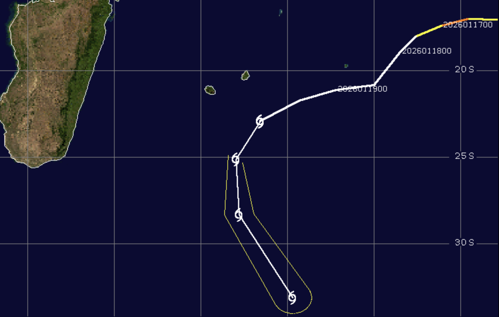 Toujours pas de changement notable dans la prévision de trajectoire. Dans les prochaines heures, DUDZAI va rencontrer des conditions néfastes et va évoluer en tempête extratropicale tout en restant en plein océan Indien, sans menace pour les îles habitées.
