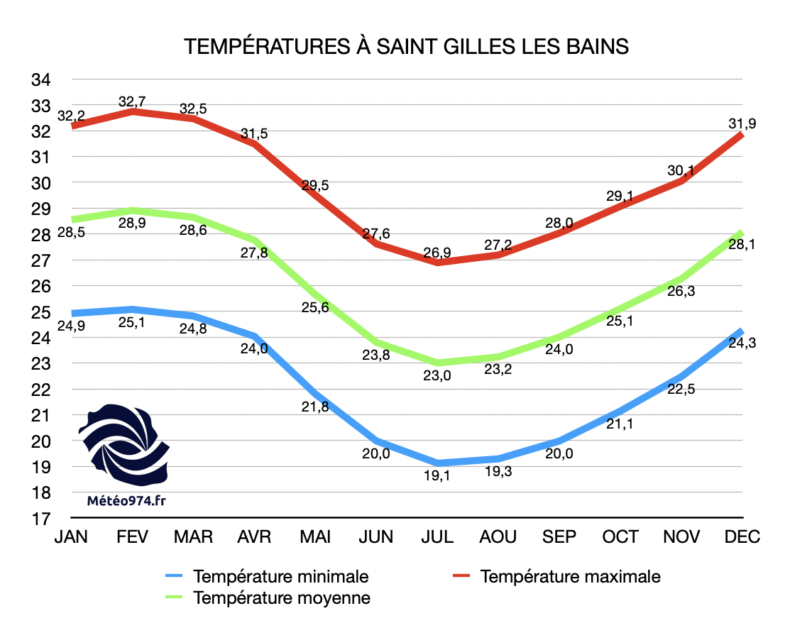 Saint-Gilles-les-Bains se situe dans l’un des secteurs les plus chauds de l’île, « sous le vent », protégée par les montagnes tels que le Maïdo et un peu plus loin de Piton des Neiges. Résultat : un temps chaud et sec une grande partie de l’année. La température moyenne annuelle se situe à 22,2 degrés pour les valeurs nocturnes, 29,9 degrés pour les maximales (mi-journée) et donc 26,1 degrés de moyenne générale.