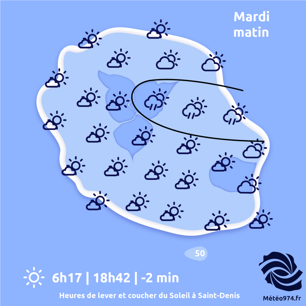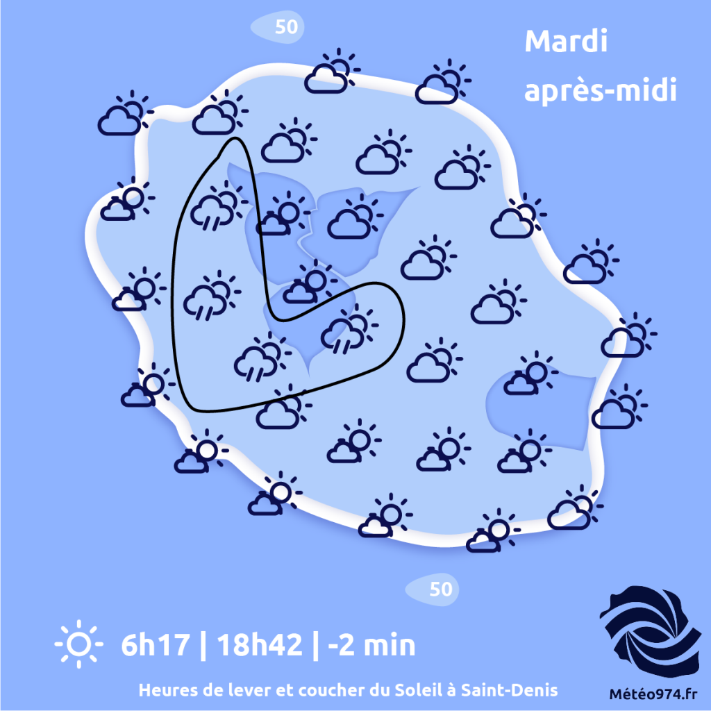 Le soleil conservera souvent l’avantage mardi après-midi malgré quelques gros cumulus ici ou là. Les nuages seront assez encombrants en revanche au Nord et à l’Est de l’île. Des Hauts de l’Ouest au Sud de Cilaos, quelques averses, plutôt faibles, pourront éclater par endroits. L’alizé sera faible à modéré de secteur est. La houle ne dépassera pas 1 mètre à 1m50. Chaleur lourde.