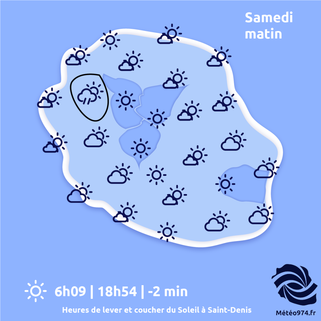 Beaucoup de soleil en perspective samedi matin sur l’ensemble de la Réunion parmi quelques petits cumulus, plus imposants au fil des heures sur les pentes. Une averse menacera avant midi dans les Hauts de Saint-Gilles. L’alizé d’est soufflera assez fort vers Saint-Denis et à Saint-Joseph. Quant à la houle, elle ne dépassera pas 1 mètre à 1m50, mais l’océan sera assez agitée dans les zones ventées. Rapidement très chaud.
