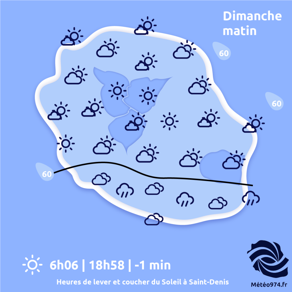 Le ciel sera bien chargé voire gris sur le sud de l’ile, pouvant donner des farines ou des faibles pluies éparses. Ailleurs, le soleil conservera encore l’avantage malgré quelques nuages de pentes. Le vent de sud-sud-est soufflera fort en marge de la dépression tropicale GEZANI entre Etang-Salé et Saint-Gilles et de Sainte-Rose à Sainte-Suzanne. La houle restera souvent autour d’1 mètre à 1m50. Chaud et lourd.